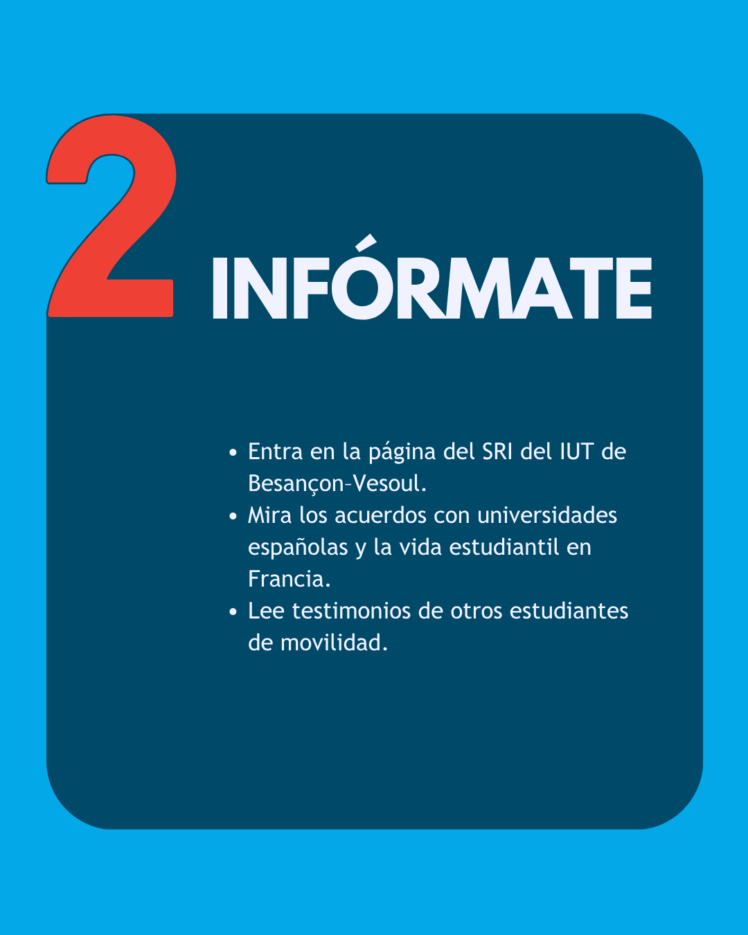 À travers ce projet, nous avons imaginé une stratégie de communication complète pour promouvoir le Service des Relations Internationales de l’IUT de Besançon-Vesoul lors d’une feria étudiante internationale. Une attention particulière a été portée à la partie réseaux sociaux, pensée comme un levier central pour informer, attirer et créer un lien avec les étudiants avant l’événement. Nous avons ainsi proposé plusieurs contenus et visuels dédiés, conçus pour rendre la communication plus claire, plus engageante et plus attractive. Ci-dessous, vous pouvez retrouver plusieurs visuels imaginés dans le cadre de cette recommandation.